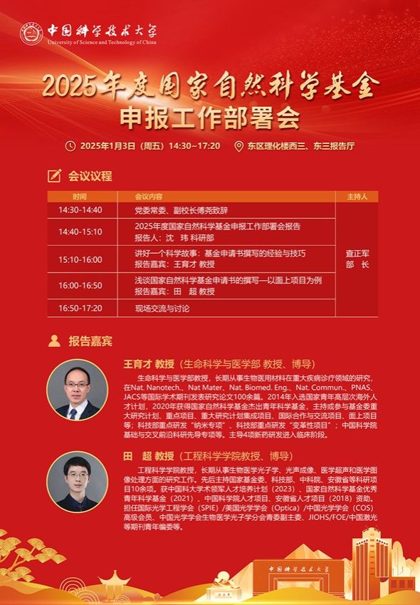 本次会议科研部特邀相关专家讲解国家基金申请书撰写技巧及分享相关经验等。具体会议安排见附件海报,敬请老师们拨冗参会,同时也欢迎感兴趣的研究生参加。